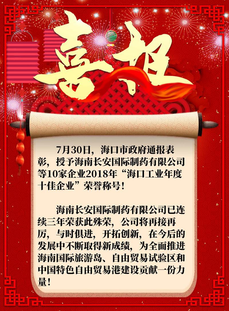 海南長安國際制藥有限公司榮獲2018年度海口工業(yè)十佳企業(yè)