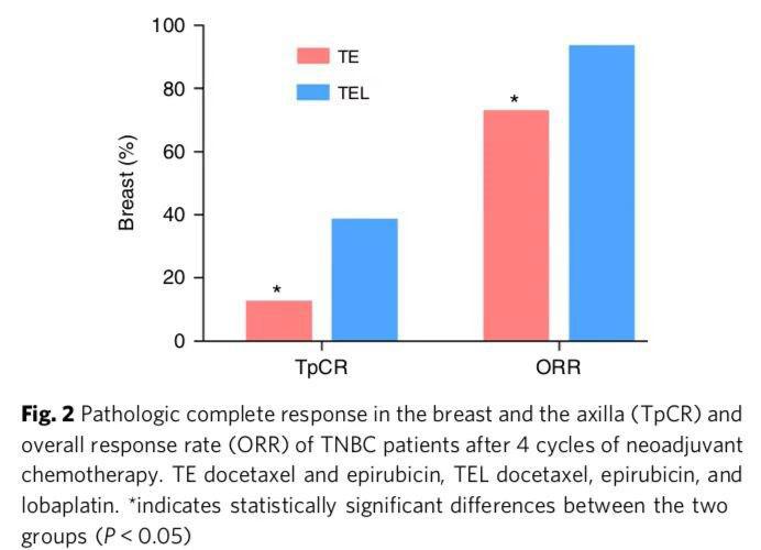 研究結(jié)果顯示:多西他賽和表柔比星方案中加入洛鉑作為TNBC的新輔助化療方案與多西他賽和表柔比星方案相比高顯著提高了TpCR率和ORR,毒性可以耐受; 短期來看還可以減少復(fù)發(fā)和轉(zhuǎn)移率。