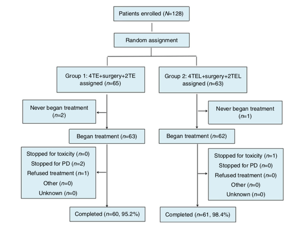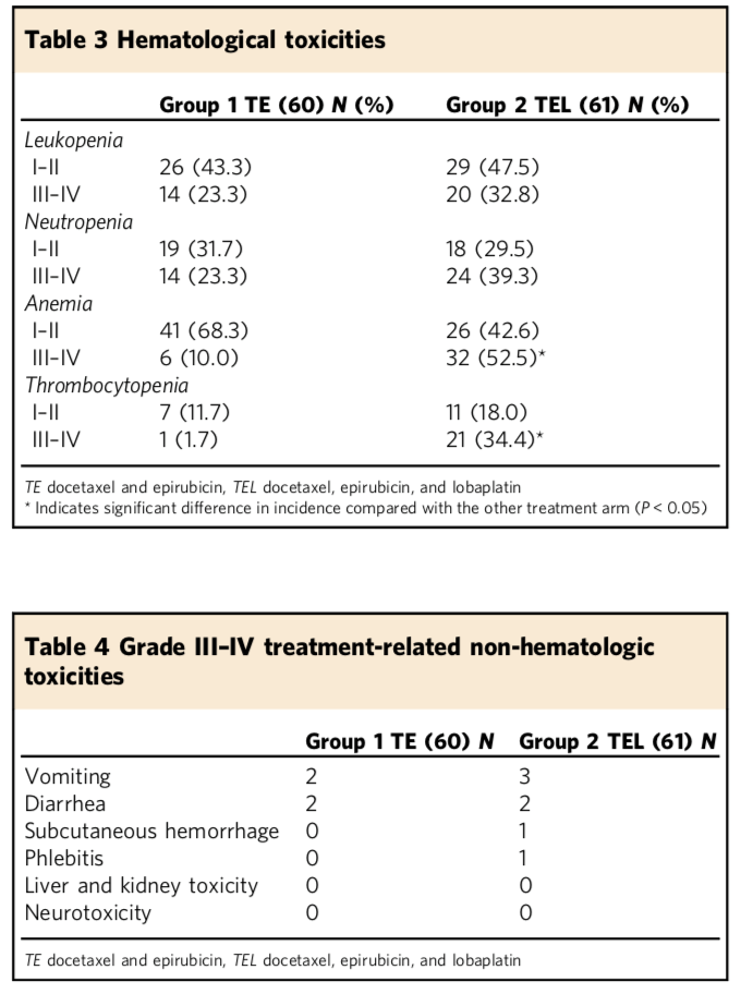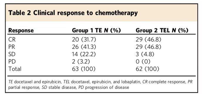 2、用藥方案:TE組63例,多西他賽 75mg/m2,表柔比星 80mg/m2, q21w,化療4個(gè)周期,手術(shù),再化療2個(gè)周期 TEL組62例,多西他賽 75mg/m2,表柔比星 80mg/m2,洛鉑30mg/m2, q21w,化療4個(gè)周期,手術(shù),再化療2個(gè)周期;