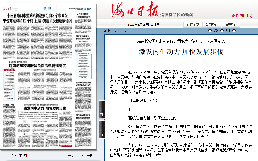 5月15日,《??谌請蟆钒l(fā)表文章——“激發(fā)內(nèi)生動力 加快發(fā)展步伐”對海南長安制藥進(jìn)行宣傳報道,文章從“蓄積紅色力量 引領(lǐng)企業(yè)發(fā)展”、“深挖內(nèi)部潛力 以創(chuàng)新謀突破”、為戰(zhàn)“疫”獻(xiàn)愛心 詮釋企業(yè)擔(dān)當(dāng)”三個方面著重對公司近年來黨建引領(lǐng)、生產(chǎn)經(jīng)營、科技創(chuàng)新、企業(yè)力量等進(jìn)行了報道。全文報道如下:
