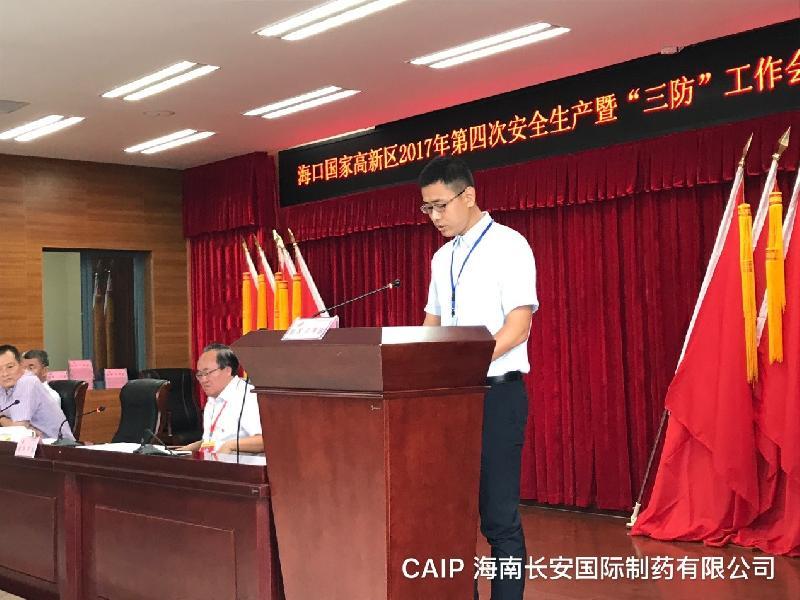 2017年10月20日,在??趪腋咝聟^(qū)2017年第四次安全生產(chǎn)暨“三防”工作會議上,海南長安國際制藥有限公司等11家企業(yè)在第20號臺風(fēng)“卡努”期間,積極配合高新區(qū)管委會做好防風(fēng)防汛及臨時避險點的安置工作,獲得“優(yōu)秀企業(yè)”表彰,公司有幸代表受表彰的企業(yè)之一受邀上臺發(fā)言。