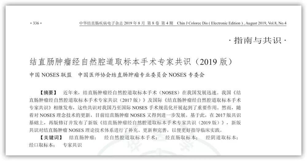 近年來,結(jié)直腸腫瘤NOSES更新速度非常快,其理論技術(shù)體系也發(fā)生很大變化,2017年發(fā)布的《結(jié)直腸腫瘤經(jīng)自然腔道取標(biāo)本手術(shù)專家共識(shí)(2017 版)》中很多內(nèi)容也無法滿足目前NOSES手術(shù)的臨床需要。基于此,中國醫(yī)師協(xié)會(huì)結(jié)直腸腫瘤專業(yè)委員會(huì) NOSES 專委會(huì)及中國NOSES 聯(lián)盟的數(shù)十位專家,在 2017 版共識(shí)的基礎(chǔ)上,共同再版起草了《結(jié)直腸腫瘤經(jīng)自然腔道取標(biāo)本手術(shù)專家共識(shí)(2019 版)》(以下簡稱《共識(shí)》)。